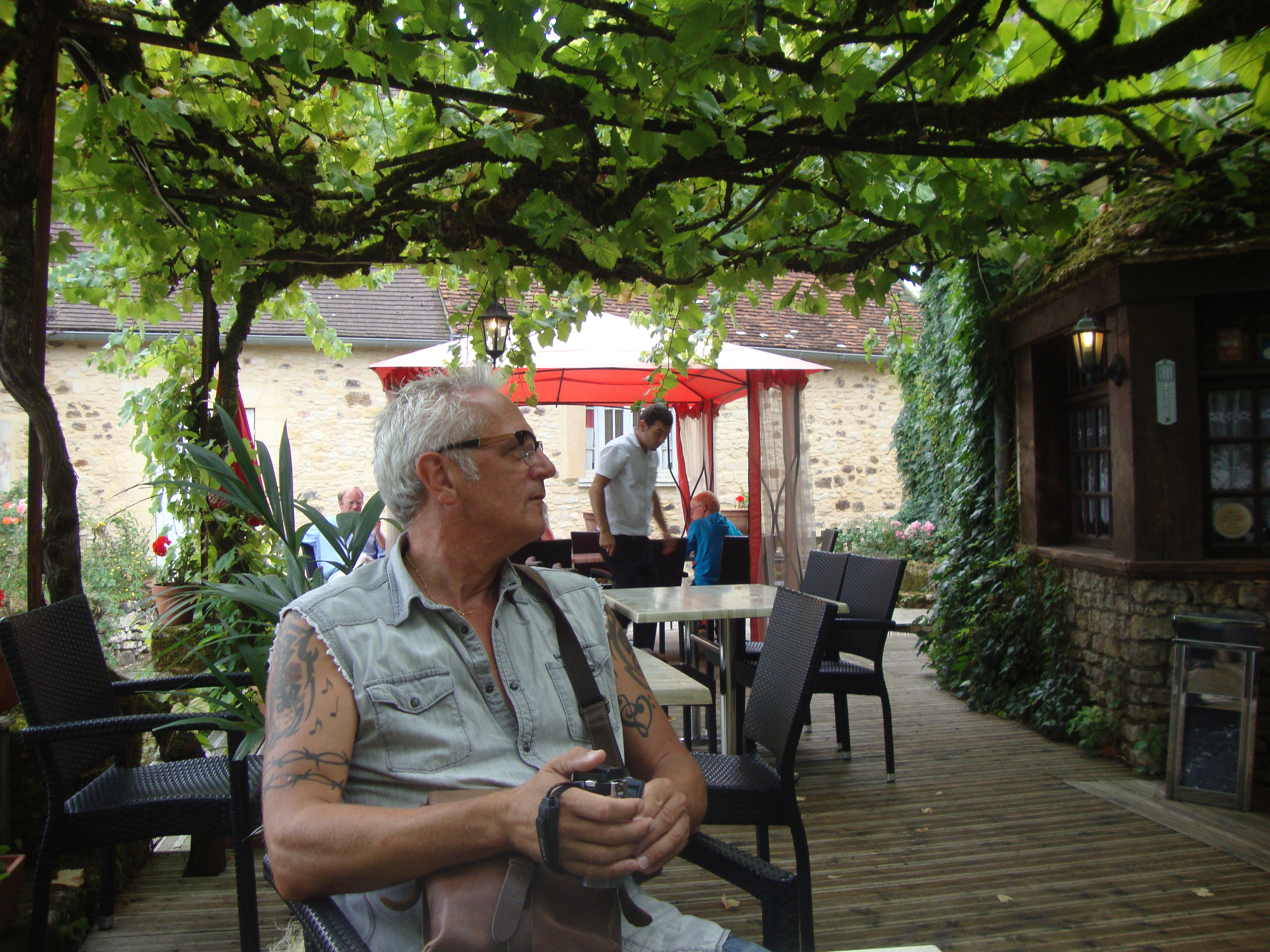 in Lalinde hebben we nog lekker een ijsje gegeten aan de Dordogne oever met dit uitzicht…. en na een boterham werd het nog heel gezellig… met z’n allen op het terras bij Lesley & David en Pieter die gitaar speelde….